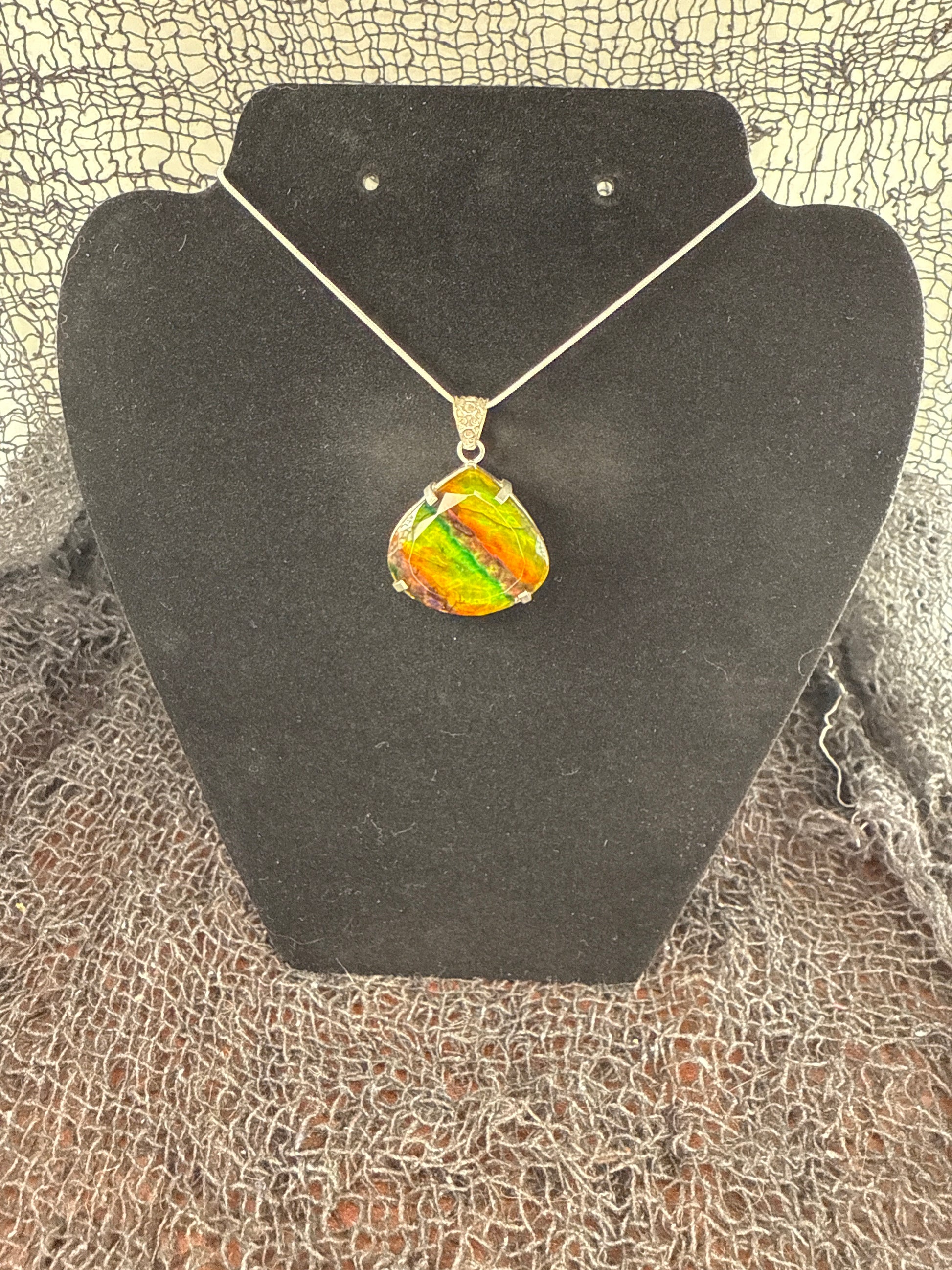 78.59ct Ammolite hand cut and polished. Set in .925 Silver.