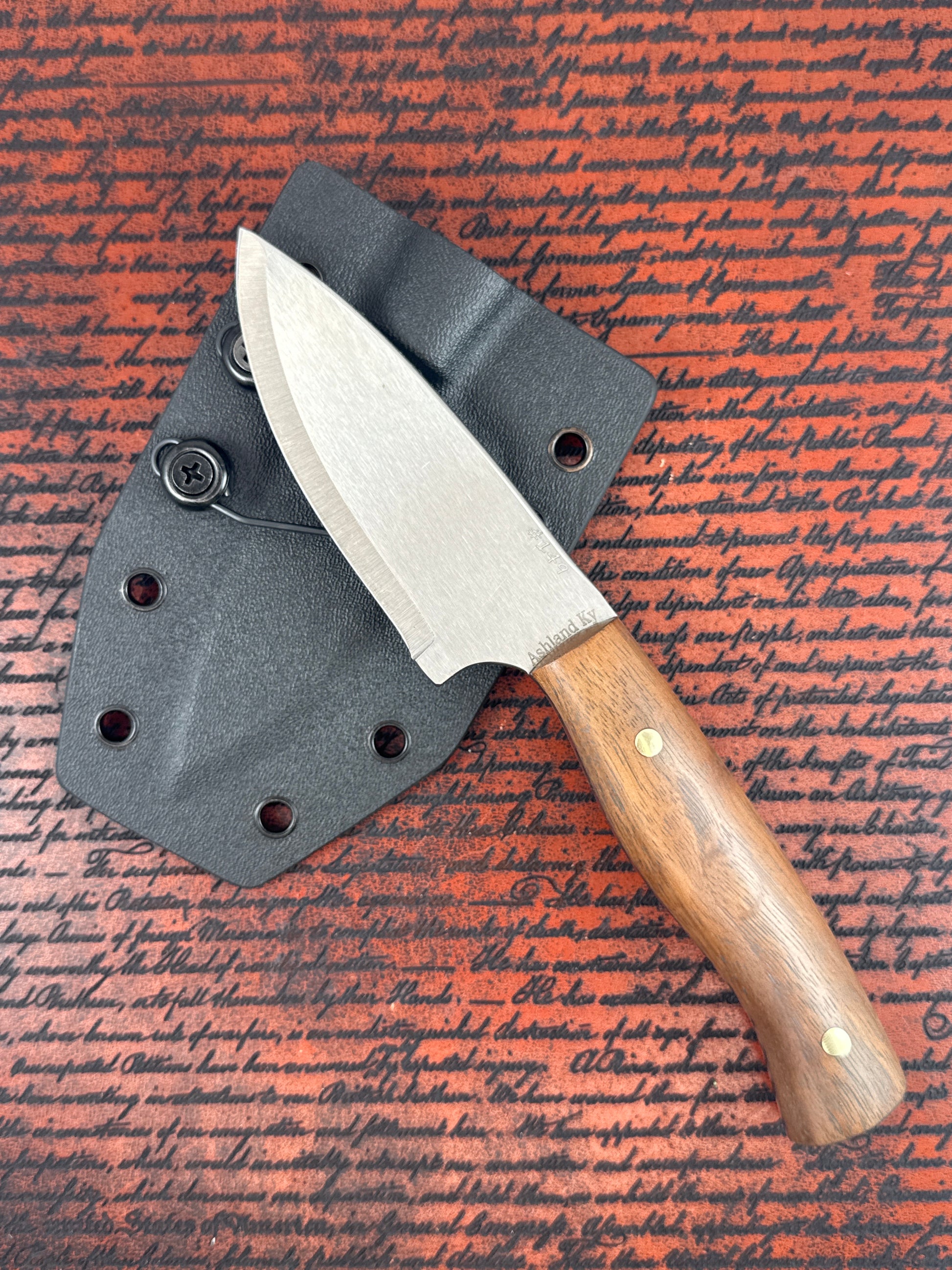 The sleek Chechen wood handle paired with bold Brass Corby bolts gives this knife a clean, modern contrast that feels as good in the hand as it looks. Lightweight yet rugged, it’s ready for the shop, the field, or wherever your day takes you.