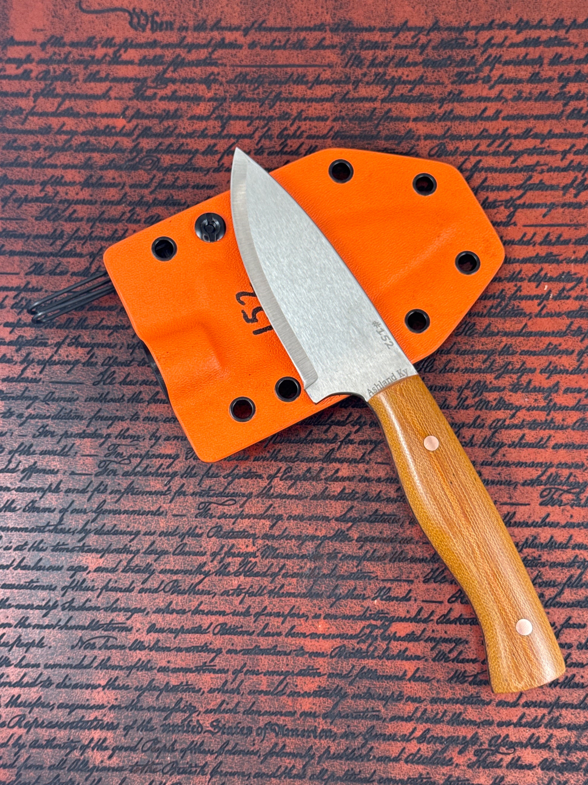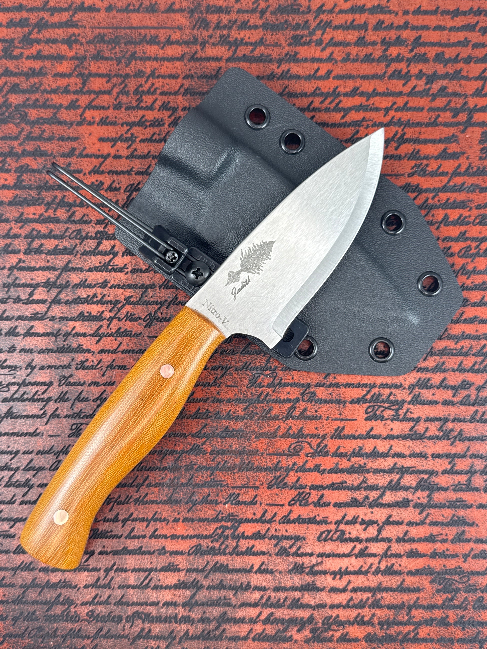 The sleek Noodle Micarta handle paired with bold Copper Corby bolts gives this knife a clean, modern contrast that feels as good in the hand as it looks. Lightweight yet rugged, it’s ready for the shop, the field, or wherever your day takes you.