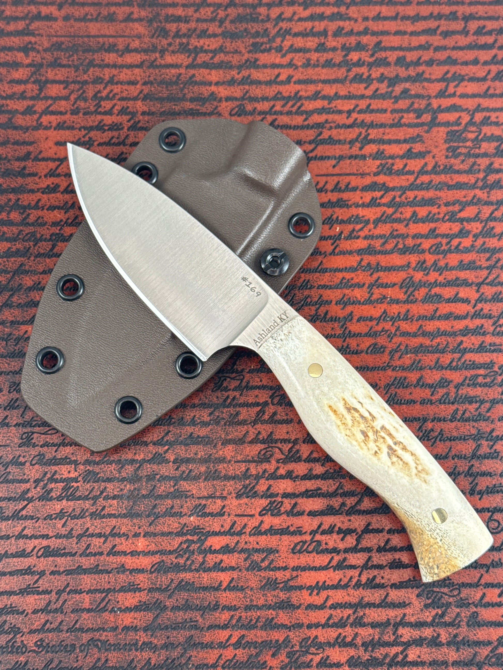 The handle is crafted from authentic whitetail deer antler and secured with brass Corby bolts, giving each knife a one-of-a-kind look rooted in the outdoors.