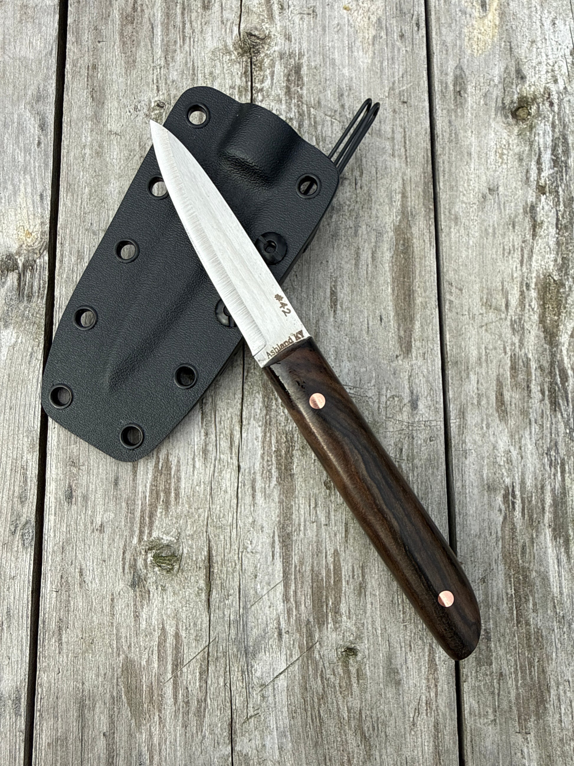 A bold wood handle, paired with Copper Corby bolts, gives this blade the perfect mix of rugged durability and standout style. The grip feels as solid as it looks, ready for real work.