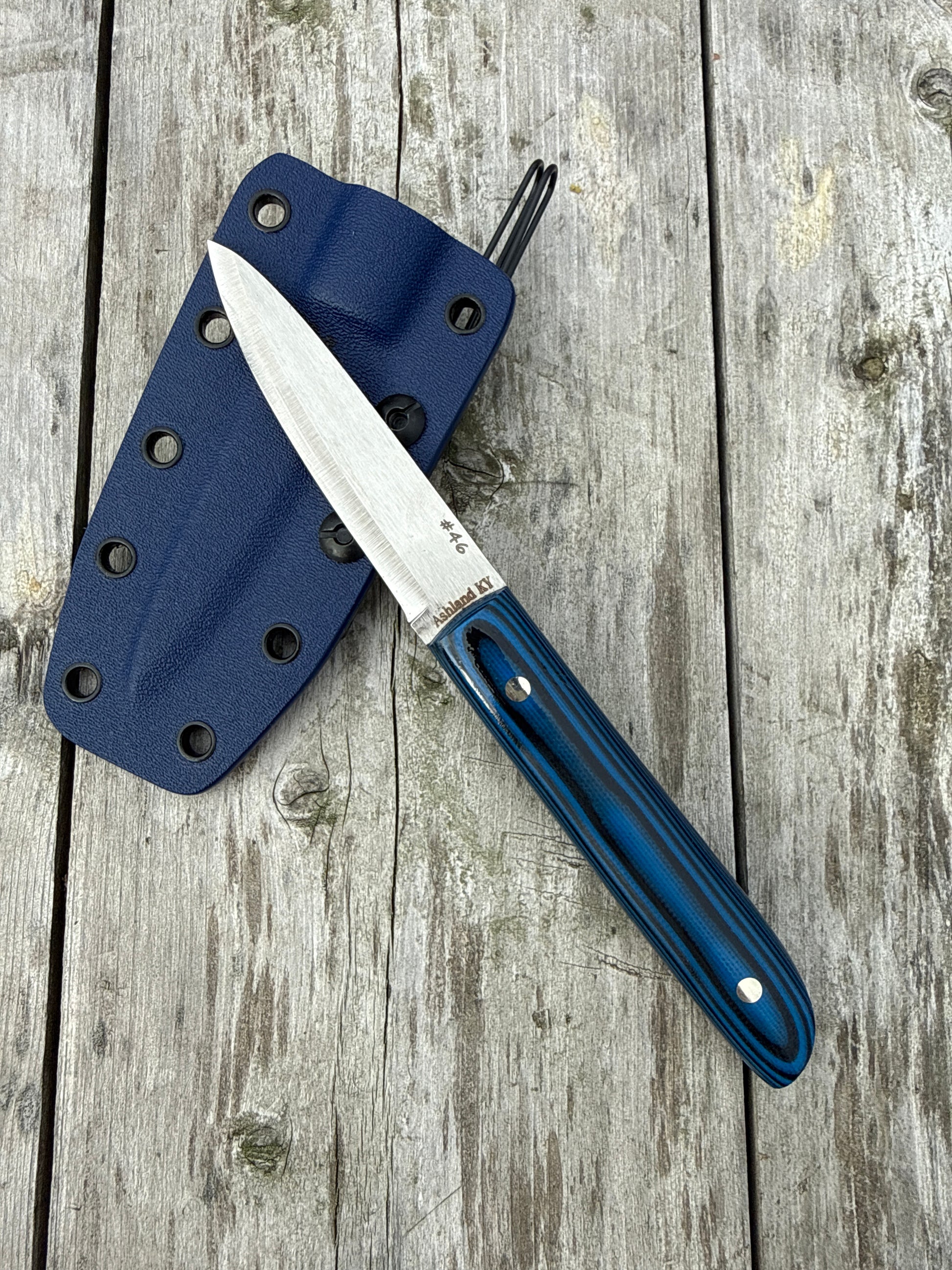 A bold Black and Blue G10 handle, paired with Nickel Silver Corby bolts, gives this blade the perfect mix of rugged durability and standout style. The grip feels as solid as it looks, ready for real work.