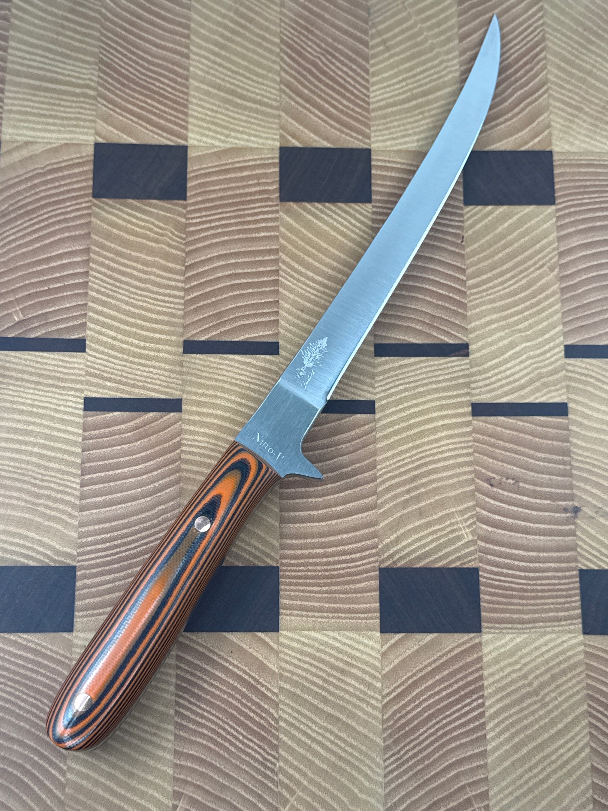 At 11" overall with a 6.5" cutting edge, the Noodler gives you the length and control you need to make quick work of fish or delicate cuts. The Black and Orange G-10 handle with classic Copper Corby Bolts provides a comfortable, slip-resistant grip—even when the job gets messy.