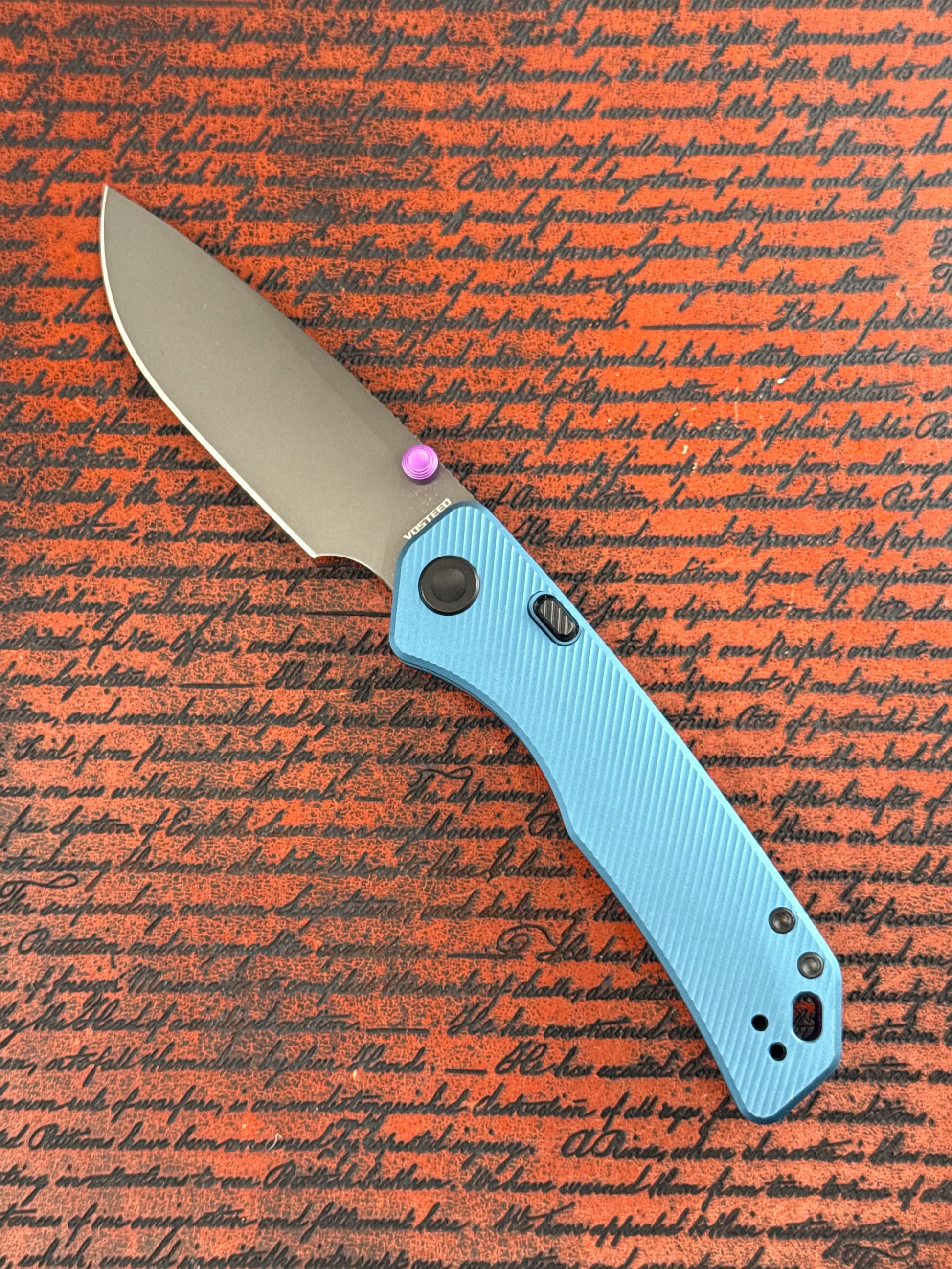 Vosteed A1612 Marten- destroyer gray blade- steel blue aluminum handle- purple thumb studs- 154CM blade